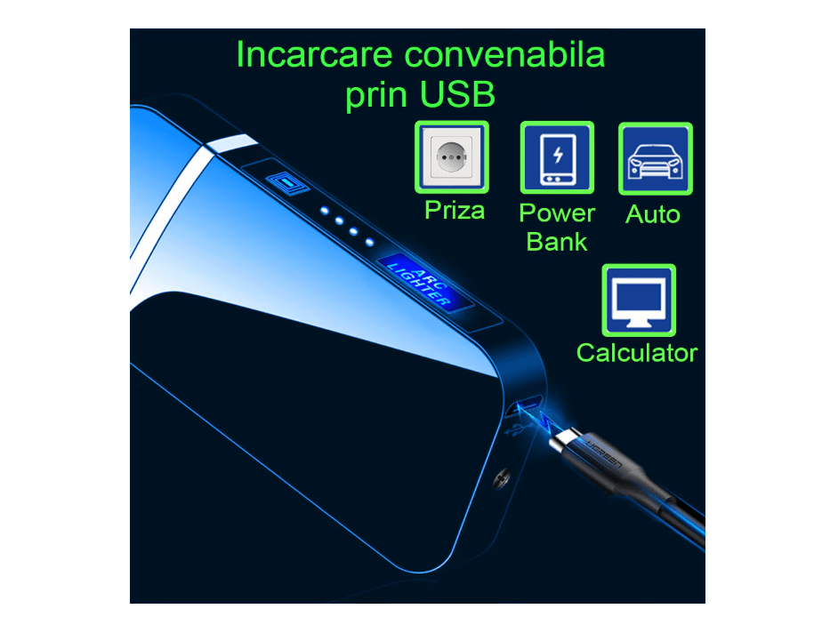 Foloseste orice cablu USB (inclus in pachet) pentru a reincarca rapid bricheta din laptop, masina sau adaptor de priza. Bateria rezista pana la 100–200 de aprinderi la o singura incarcare completa.