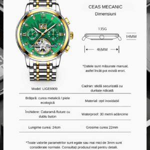 Mecanismul automatic functioneaza fara baterie, fiind alimentat de miscarea naturala a mainii, oferind autenticitate si fiabilitate pe termen lung.