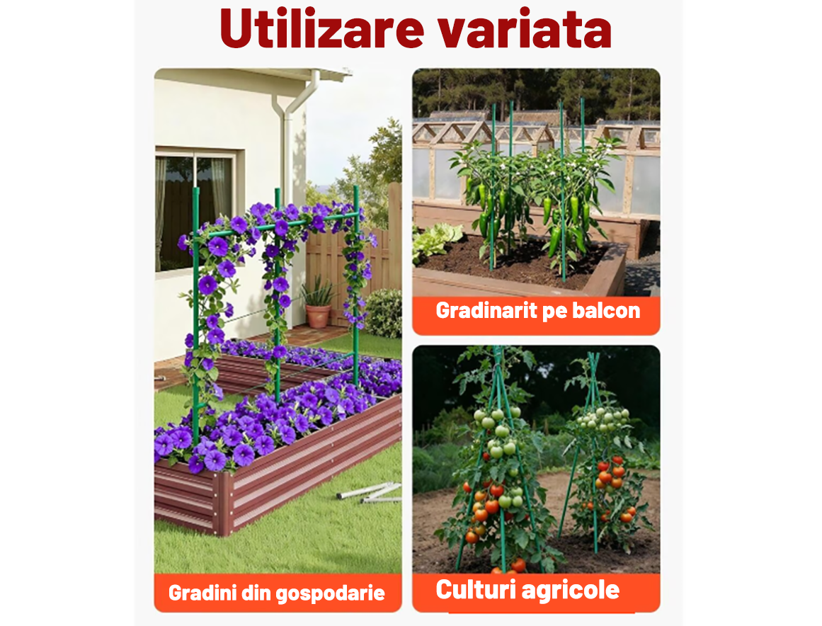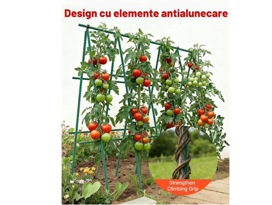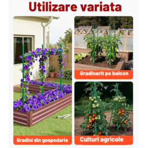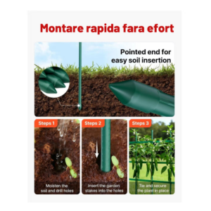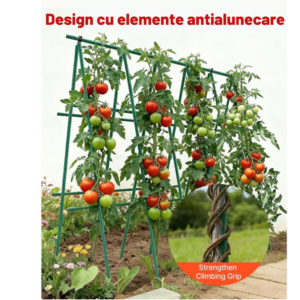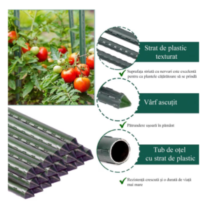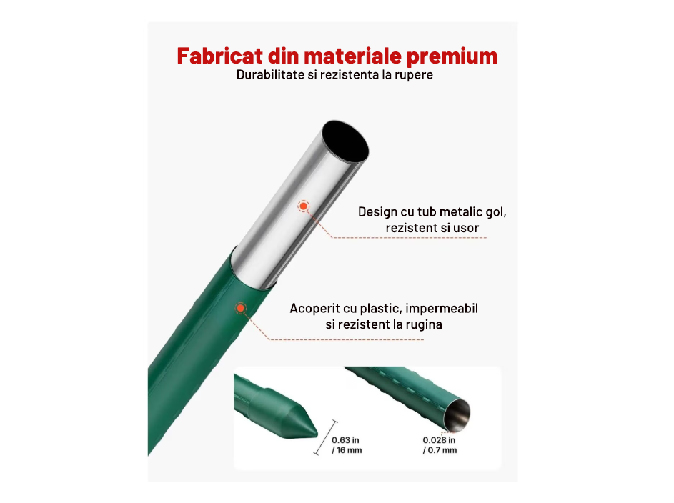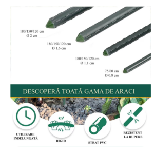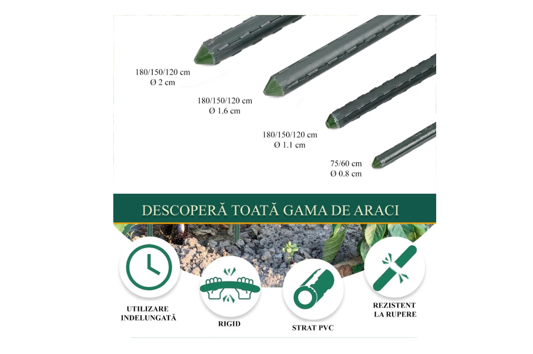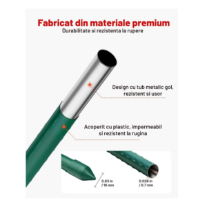 Constructia robusta si diametrul de 1.6 cm ofera o stabilitate superioara fata de aracii subtiri, iar stratul de PVC protejeaza metalul impotriva coroziunii si umezelii, permitand reutilizarea produsului sezon dupa sezon.